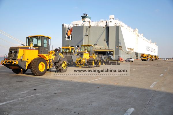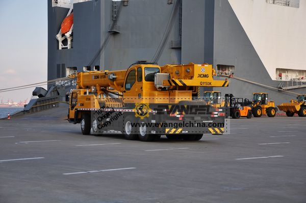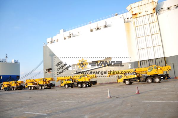 On Nov. 21, 2011, Evangel International shipped two units XCMG QY25K truck cranes and two units QY50K truck cranes to Algeria, by RoRo ship. Together with the four units truck cranes, the same client bought two units XCMG ZL50G wheel loaders.