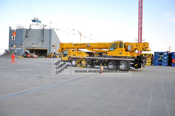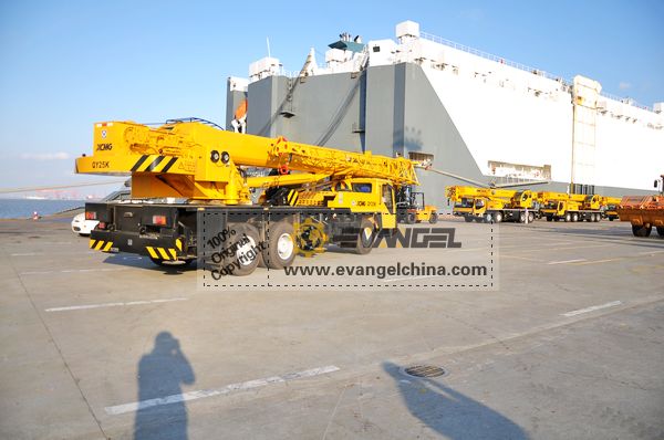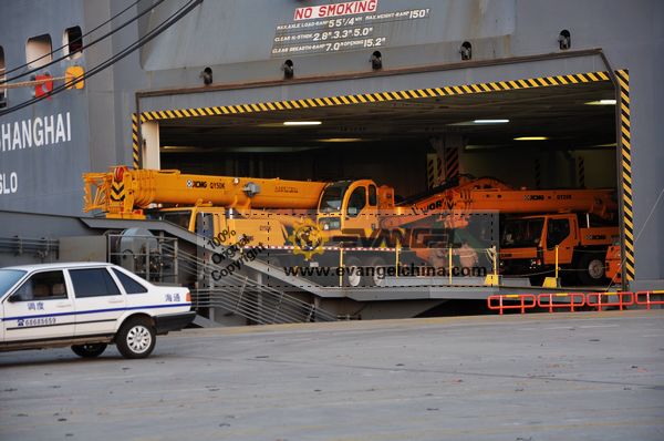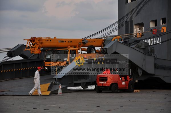 On Nov. 21, 2011, Evangel International shipped two units XCMG QY25K truck cranes and two units QY50K truck cranes to Algeria, by RoRo ship. Together with the four units truck cranes, the same client bought two units XCMG ZL50G wheel loaders.